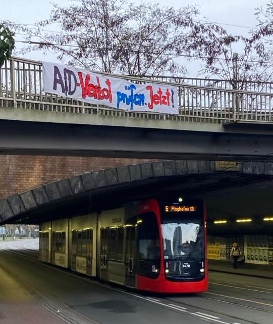 Wir als überparteiliche Initiative „Bremen bleibt stabil“ haben am 5. Dezember in der Bremer Innenstadt zwei Transparente mit der Aufschrift „AfD Verbot prüfen jetzt!“ angebracht, an der Fußgängerbrücke vor dem Gustav-Detjen-Tunnel und an der Fahrradbrücke über die Bürgermeister-Smidt-Straße. Mit dieser Aktion möchten wir auf die Notwendigkeit aufmerksam machen, die Vereinbarkeit der AfD mit dem Grundgesetz juristisch überprüfen zu lassen.