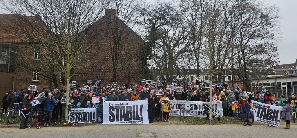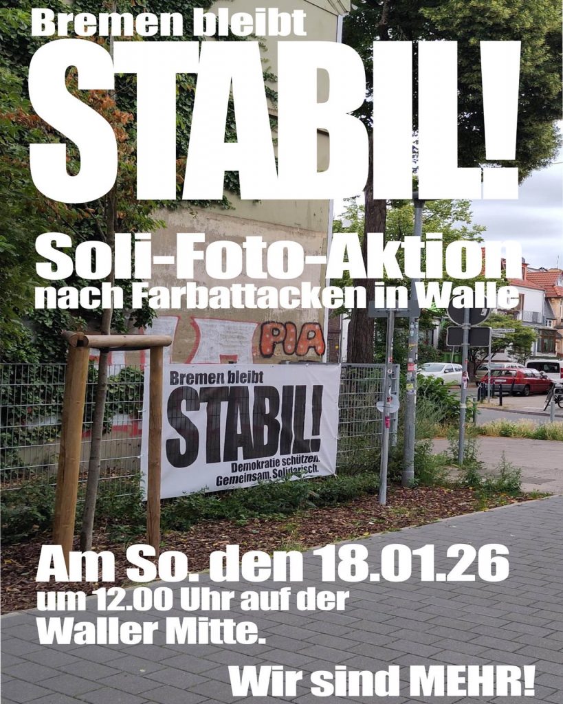 Am Sonntag, 18.1.2026, trafen sich 400 Menschen vor allem aus der Nachbarschaft in Walle um mit einem gemeinsamen Foto zu zeigen: Der überwiegende Teil der Bremer und Bremerinnen will die Demokratie schützen und wünscht sich eine solidarische Gesellschaft. Anlass sind fünf Farbattacken auf Wohnhäuser in Walle, an denen „Bremen bleibt stabil“ Plakate, eine Regenbogenfahne oder eine Antifa-Fahne hingen.
